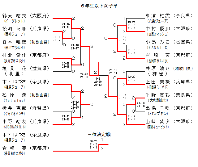 | GS6-13 | 長岡京市スポ少[京都府] | 岩崎 葵 | 2 | 21-16 21-16 | 0 | 中村 優那 | 田原スマッシュ[大阪府] | |